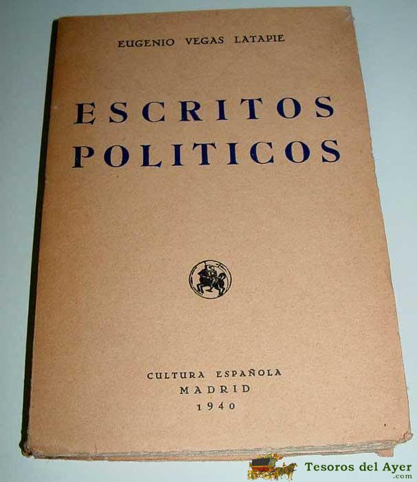 ESCRITOS POLíTICOS. VEGAS LATAPIE, EUGENIO - DEDICADO CON FIRMA AUTOGRAFA DEL AUTOR .- MONARQUIA -MADRID, CULTURA ESPAñOLA, 1940. 19X13 CM. 258 P. RúSTICA. 1ª EDICIóN EN LIBRO