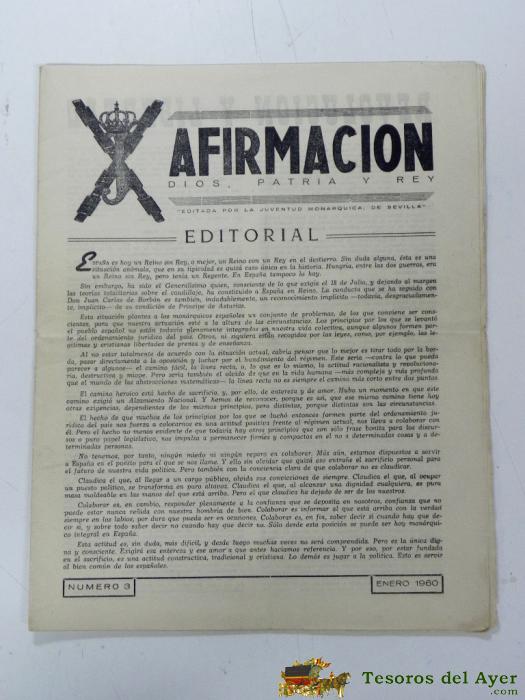 ANTIGUO PERIODICO MONARQUICO AFIRMACION, NUM. 3 ENERO DE 1960, TIENE 12 PAGINAS INCLUIDAS LAS PORTADAS. DIOS, PATRIA Y REY, EDITADA POR LA JUVENTUD MONARQUICA DE SEVILLA, MIDE 30 X 24 CMS.