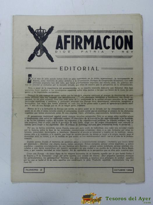 ANTIGUO PERIODICO MONARQUICO AFIRMACION, NUM. 2 OCTUBRE DE 1959, TIENE 12 PAGINAS INCLUIDAS LAS PORTADAS. DIOS, PATRIA Y REY, EDITADA POR LA JUVENTUD MONARQUICA DE SEVILLA, MIDE 30 X 24 CMS.