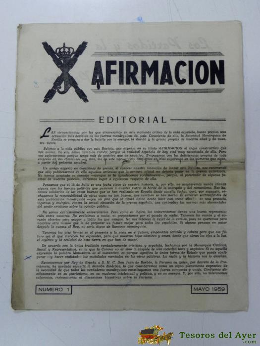 ANTIGUO PERIODICO MONARQUICO AFIRMACION, NUM. 1 MAYO DE 1959, TIENE 12 PAGINAS INCLUIDAS LAS PORTADAS. DIOS, PATRIA Y REY, EDITADA POR LA JUVENTUD MONARQUICA DE SEVILLA, MIDE 30 X 24 CMS.