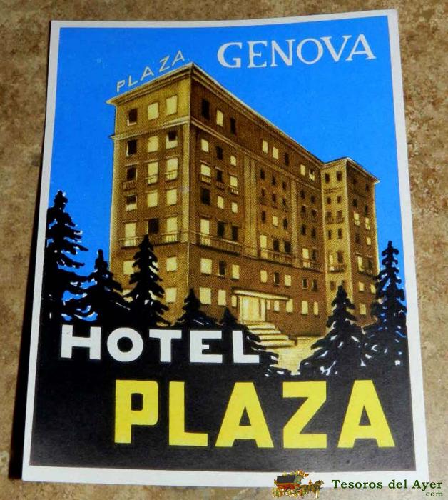 ANTIGUA ETIQUETA DE MALETA - ANTIQUE LUGGAGE BAGAGE LABEL - ANCIEN ETIQUETTE LA VALISE - HOTEL PLAZA, GENOVA - TAL COMO SE VE EN LA FOTO.