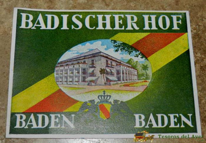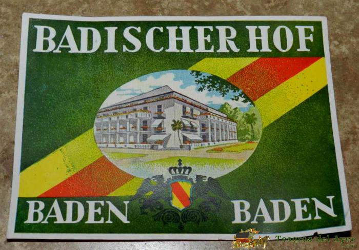 ANTIGUA ETIQUETA DE MALETA - ANTIQUE LUGGAGE BAGAGE LABEL - ANCIEN ETIQUETTE LA VALISE - HOTEL BADISCHERHOF, BADEN BADEN, ETIQUETA GRANDE - TAL COMO SE VE EN LA FOTO.
