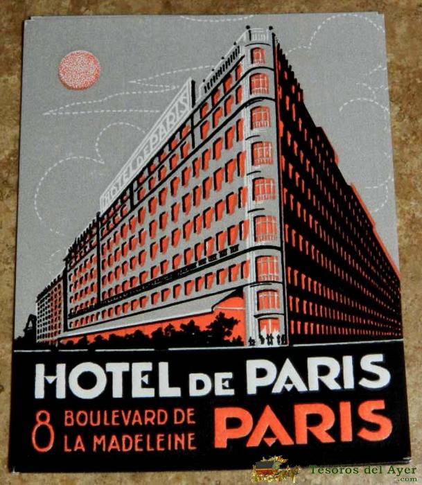ANTIGUA ETIQUETA DE MALETA - ANTIQUE LUGGAGE BAGAGE LABEL - ANCIEN ETIQUETTE LA VALISE - HOTEL DE PARIS - TAL COMO SE VE EN LA FOTO.