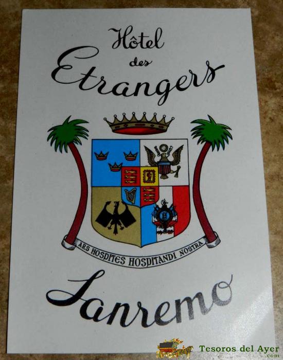 ANTIGUA ETIQUETA DE MALETA - ANTIQUE LUGGAGE BAGAGE LABEL - ANCIEN ETIQUETTE LA VALISE - HOTEL ETRANGERS, SAN REMO, TAL COMO SE VE EN LA FOTO.