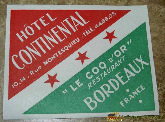 ANTIGUA ETIQUETA DE MALETA - ANTIQUE LUGGAGE BAGAGE LABEL - ANCIEN ETIQUETTE LA VALISE - HOTEL CONTINENTAL, BORDEAUX, TAL COMO SE VE EN LA FOTO.