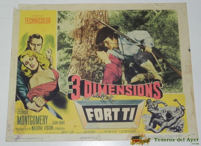 ANTIGUO CARTEL, CARTELERA DE CINE DE LA PELICULA FORT TI, 3 DIMENSIONS, CARTON, GEORGE MOONTGOMERY, JOAN VOHS, AÑO 1953, MIDE 35 X 28 CMS, PEQUEñOS DESPERFECTOS.