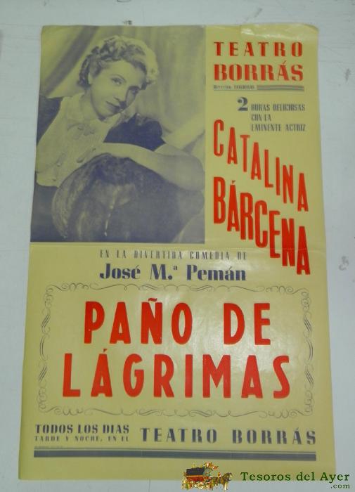 ANTIGUO CARTEL DE LA OBRA DE JOSE Mª PEMAN PAÑO DE LAGRIMAS - CON LA EMINENTE ACTRIZ CATALINA BARCENA EN EL TEATRO BORRAS - SE ENCUENTRA EN PERFECTO ESTADO - MIDE 50 X 32 CMS.