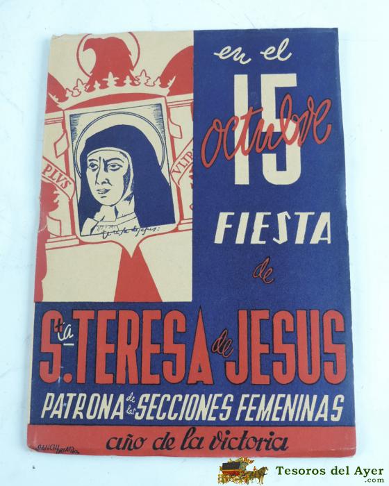 CUADERNILLO DE SANTA TERESA DE JESUS, EN EL 15 DE OCTUBRE FIESTA DE SANTA TERESA DE JESúS PATRONA DE LAS SECCIONES FEMENINAS. AÑO 1940 MADRID. MADRID, TALLERES GRáFICOS MARSIEGA, MIDE 24,5 X 17,5 CM., 45 PáGS. + 1 H. + 2 LáMINAS CON TRES FOTOGRAFíAS. (CUB