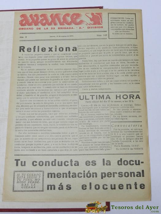 ANTIGUO PERIODICO AVANCE, ORGANO DE LA 32 BRIGADA. 3ª DIVISION, MARIA DE LA ALAMEDA, 18 DE MARZO DE 1937, PLENA GUERRA CIVIL, AÑO 2 NUM. 149, LOS EX GENERALES TRAIDORES FRACASAN UNA VEZ MAS ANTE EL MUNDO ENTERO, MIDE 33,5 X 24 CMS. 4 PAG.