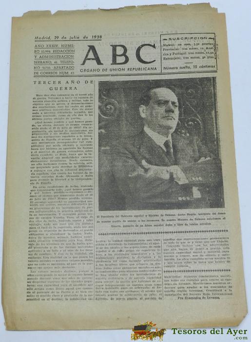 ANTIGUO PERIODICO ABC - ORGANO DE UNION REPUBLICANA - 29 DE JULIO DE 1938 - PLENA GUERRA CIVIL - NEGRIN EN PORTADA - 8 PAG - MIDE 33 X 25 CMS.