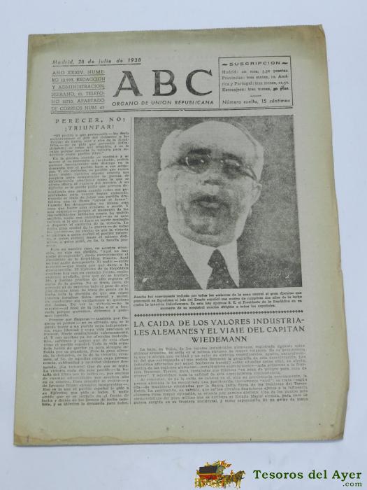 ANTIGUO PERIODICO ABC - ORGANO DE UNION REPUBLICANA - 28 DE JULIO DE 1938 - PLENA GUERRA CIVIL - MANUEL AZAÑA EN PORTADA - 8 PAG - MIDE 33 X 25 CMS.