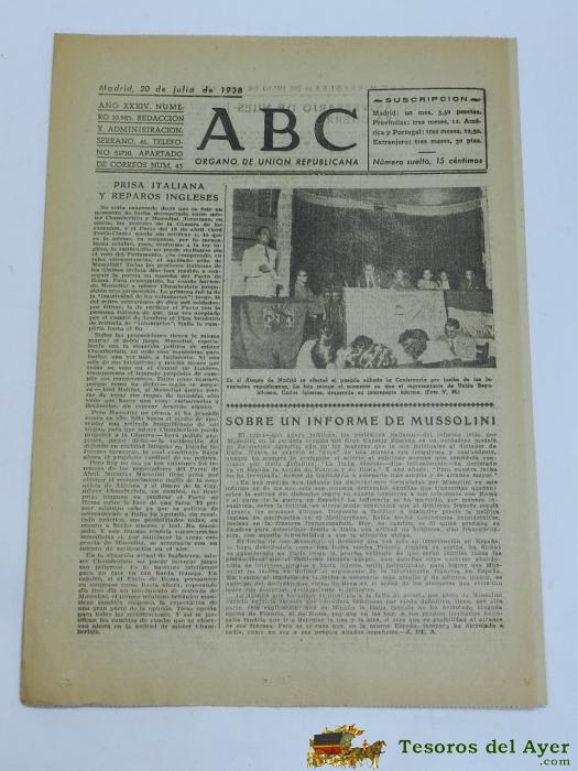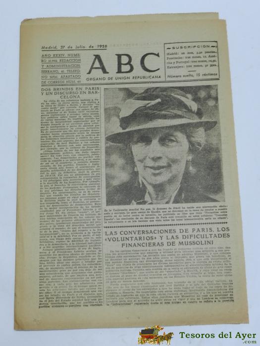 ANTIGUO PERIODICO ABC - ORGANO DE UNION REPUBLICANA - 27 DE JULIO DE 1938 - PLENA GUERRA CIVIL - LAS CONVERSACIONES DE PARIS, LOS VOLUNTARIOS Y LAS DIFICULTADES FINANCIERAS DE MUSSOLINI. CHAMBERLAIN LAMENTA QUE NO SE HAYA RESUELTO AUN LOS QUE EL DENOMINA