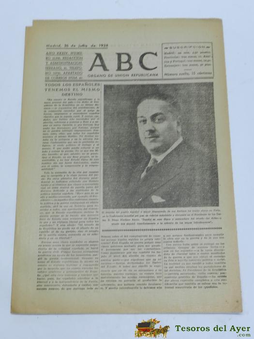 ANTIGUO PERIODICO ABC - ORGANO DE UNION REPUBLICANA - 26 DE JULIO DE 1938 - PLENA GUERRA CIVIL - DIEGO MARTINEZ BARRIO, PRESIDENTE DE LAS CORTES. - 8 PAG - MIDE 33 X 25 CMS.