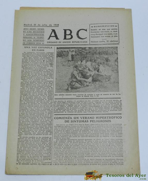 ANTIGUO PERIODICO ABC - ORGANO DE UNION REPUBLICANA - 25 DE JULIO DE 1938 - PLENA GUERRA CIVIL - SOLDADOS SANITARIOS EN LOS FRENTES DE MADRID. - 8 PAG - MIDE 33 X 25 CMS.
