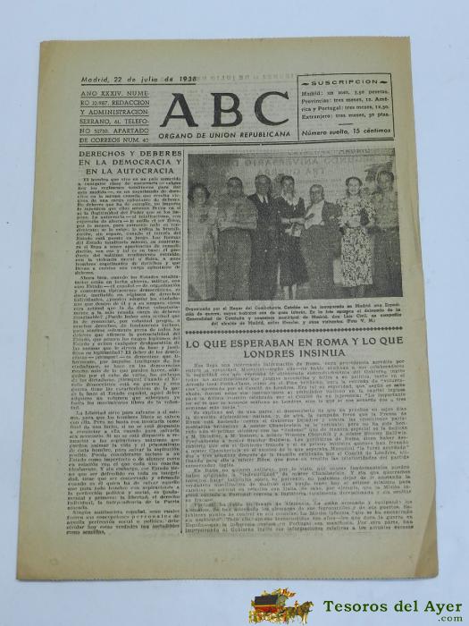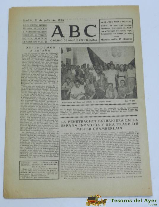 ANTIGUO PERIODICO ABC - ORGANO DE UNION REPUBLICANA - 23 DE JULIO DE 1938 - PLENA GUERRA CIVIL - INAGURACION DEL SOLDADO EN UN HOSPITAL MILITAR, LA PENETRACION EXTRANJERA EN LA ESPAÑA INVADIDA Y UNA FRASE DE MISTER CHAMBERLAIN. - 8 PAG - MIDE 33 X 25 CMS.