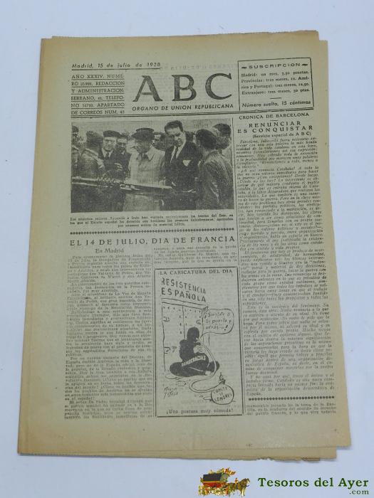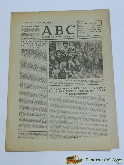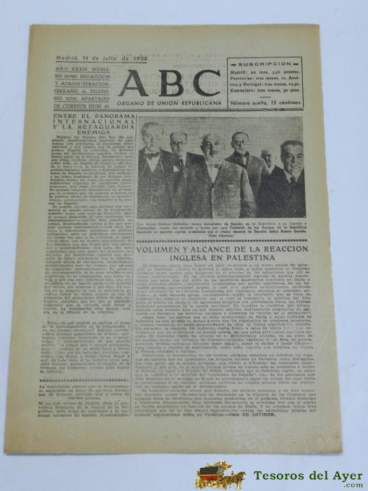 ANTIGUO PERIODICO ABC - ORGANO DE UNION REPUBLICANA - 15 DE JULIO DE 1938 - PLENA GUERRA CIVIL - EN LEVANTE, LAS TROPAS ESPAÑOLAS HAN CONQUISTADO VARIAS POSICIONES IMPORTANTES - 8 PAG - MIDE 33 X 25 CMS.