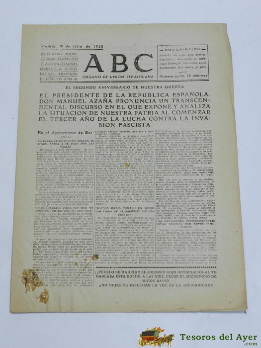 ANTIGUO PERIODICO ABC - ORGANO DE UNION REPUBLICANA - 19 DE JULIO DE 1938 - PLENA GUERRA CIVIL - EL PRESIDENTE DE LA REPUBLICA ESPAÑOLA, DON MANUEL AZAÑA, PRONUNCIA UN DISCURSO CONTRA LA INVASION FASCISTA - 8 PAG - MIDE 33 X 25 CMS.
