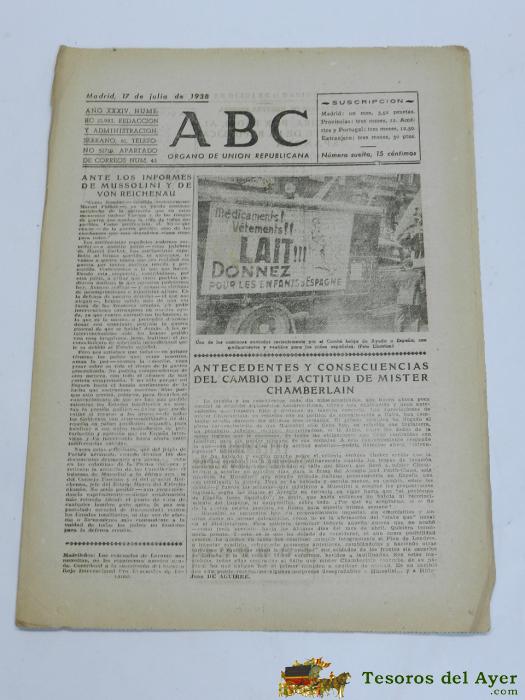 ANTIGUO PERIODICO ABC - ORGANO DE UNION REPUBLICANA - 17 DE JULIO DE 1938 - PLENA GUERRA CIVIL - CAMBIO DE ACTITUD DE MISTER CHAMBERLAIN - 8 PAG - MIDE 33 X 25 CMS.