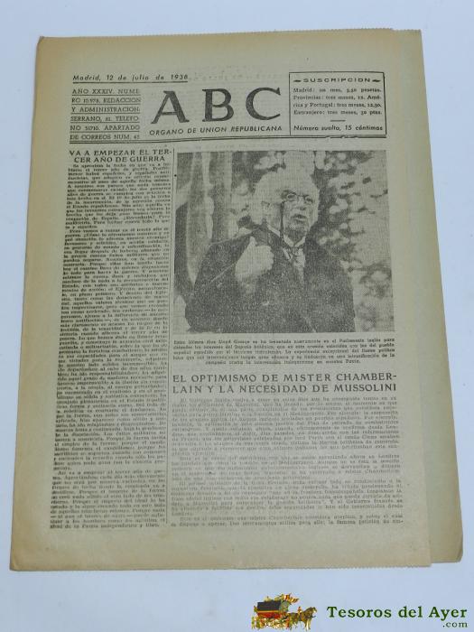 ANTIGUO PERIODICO ABC - ORGANO DE UNION REPUBLICANA - 12 DE JULIO DE 1938 - PLENA GUERRA CIVIL - EL OPTMISMO DE MISTER CHAMBERLAIN Y LA NECESIDAD DE MUSSOLINI - 8 PAG - MIDE 33 X 25 CMS.
