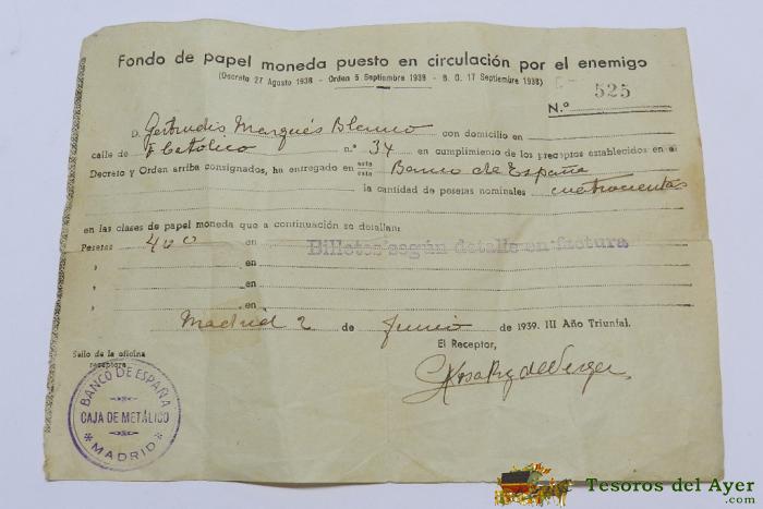 FONDO DE PAPEL MONEDA PUESTO EN CIRCULACION POR EL ENEMIGO, CON FECHA MADRID 2 DE JUNIO DE 1939 BANCO DE ESPAñA, MADRID, MIDE 19 X 14 CMS.