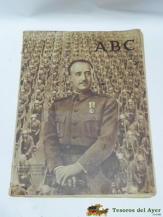 ANTIGUO PERIODICO ABC CON FRANCO CON LA MEDALLA INDIVIDUAL, 28 DE MARZO DE 1940, NUMERO EXTRAORDINARIO CONMEMORATIVO DE LA LIBERACION DE MADRID, MUCHISIMAS FOTOGRAFIAS, 18 PAGINAS CONTANDO CON LAS CUBIERTAS.