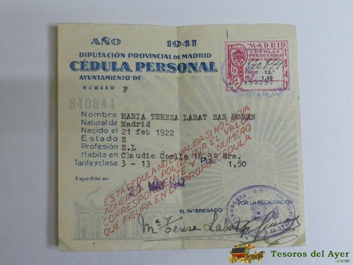 CEDULA PERSONAL AÑO 1941, DIPUTACION PROVINCIAL MADRID, MIDE 13 X 12 CMS.