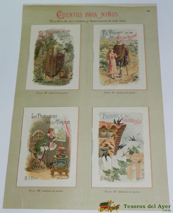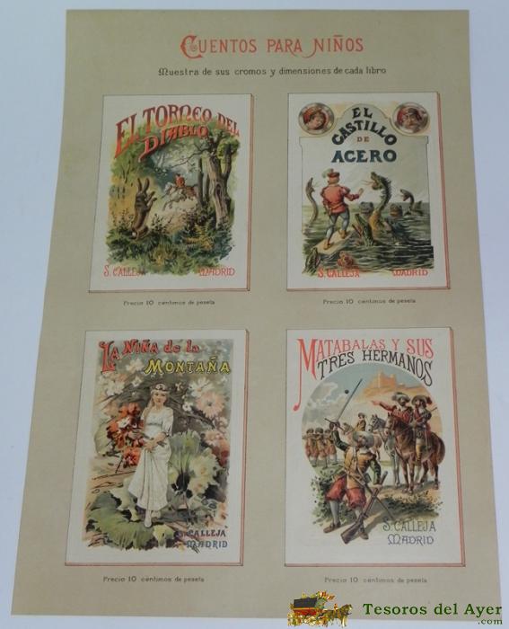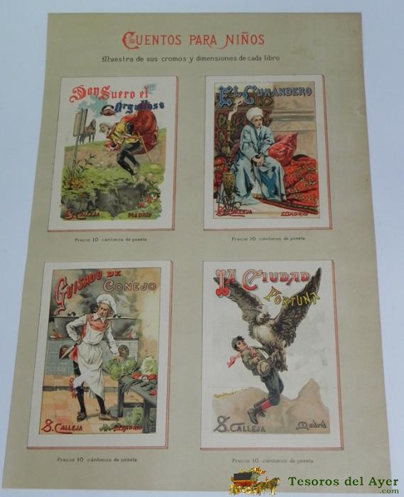 ANTIGUO CARTEL CON PUBLICIDAD DE LOS CUENTOS DE CALLEJA, CUENTOS PARA NIÑOS - COMPLEAMENTE ANTIGUO Y ORIGINAL - MUESTRA DE SUS CROMOS Y DIMENSIONES DE CADA LIBRO, POR LA PARTE TRASERA VA TAMBIEN IMPRESO, SEGURAMENTE SE PONIAN EN LAS ANTIGUAS LIBRERIAS. MI