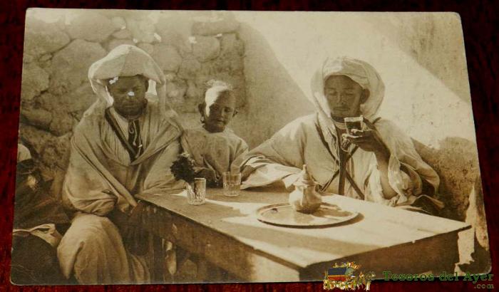 ANTIGUA POSTAL DE TIPOS Y CONSTUMBRES RIFEÑAS, TOMANDO EL THE, 2ª SERIE N. 10, FOTOTIPIA HAUSER Y MENET, NO CIRCULADA.