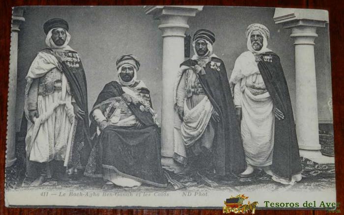 ANTIGUA POSTAL DE ARGELIA, LE BACH-AGHA BEN-GANAH ET LES CAIDS, N. 411, ED. N D, NO CIRCULADA.