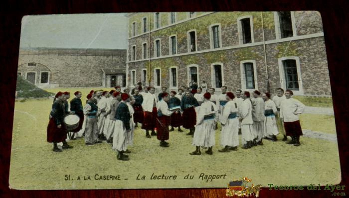 ANTIGUA POSTAL LA CASERNE, LA LECTURE DU RAPPORT, N. 51, NO CIRCULADA, ESCRITA.