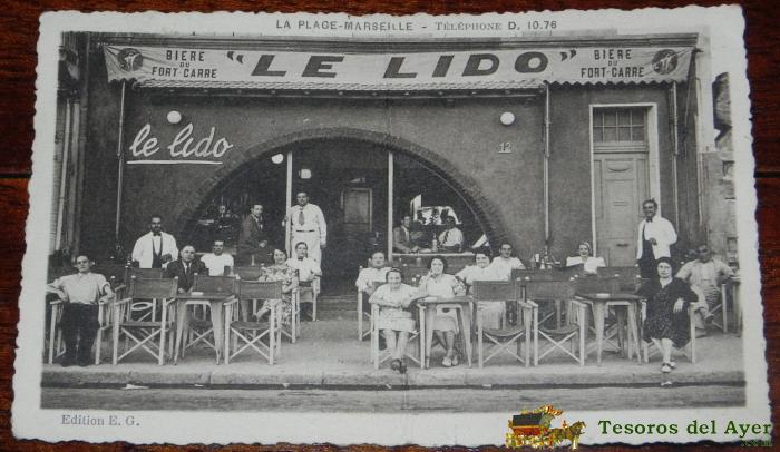 ANTIGUA POSTAL DE MARSEILLE, LA PLAGE, FRANCIA, BIERE DU FORT CARRE, LE LIDO, ED. E.G., NO CIRCULADA, FUERTE DOBLEZ EN EL CENTRO DE LA POSTAL.