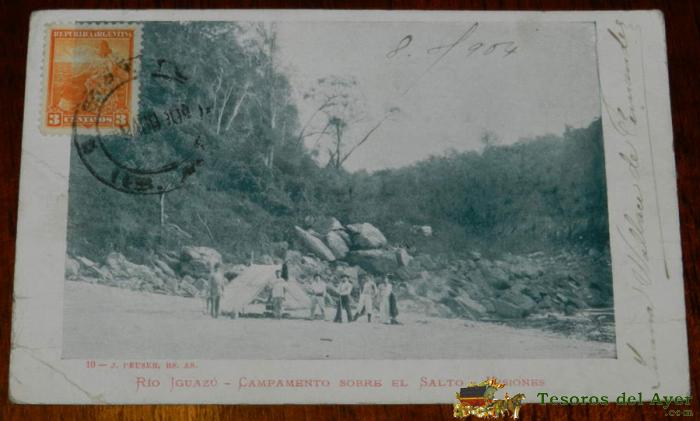 ANTIGUA POSTAL DE RIO IGUAZU, ARGENTINA, CAMPAMENTO SOBRE EL SALTO, CIRCULADA, ED. J. PEUSER, N. 10.