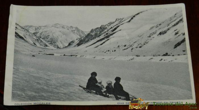 ANTIGUA POSTAL DE ARGENTINA, DIAS DE INVIERNO, VIAJANDO EN TRINEO, COLECCION MORALES, SIN CIRCULAR, REVERSO CON PUBLICIDAD DE HOTELES SUD AMERICANOS.