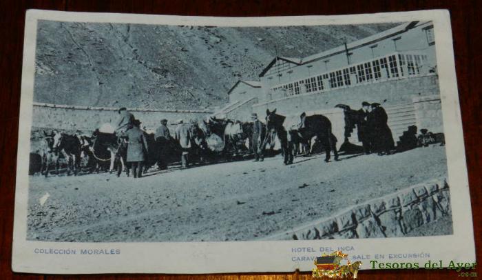 ANTIGUA POSTAL DE ARGENTINA, HOTEL DEL INCA, CARAVANA QUE SALE EN EXCURSION, COLECCION MORALES, SIN CIRCULAR, REVERSO CON PUBLICIDAD DE HOTELES SUD AMERICANOS.