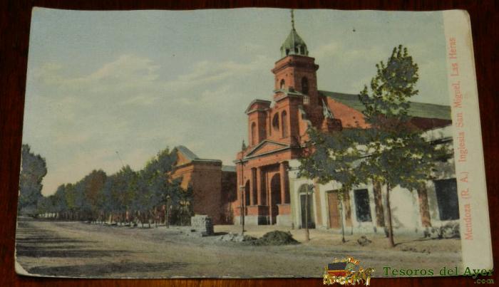 ANTIGUA POSTAL DE MENDOZA, ARGENTINA, IGLESIA SAN MIGUEL, LAS HERAS, ED. JOSE KONIG Y CIA, NO CIRCULADA.