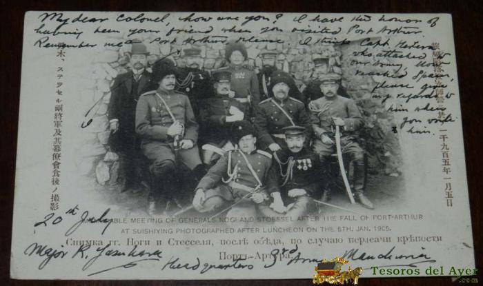 ANTIGUA FOTO POSTAL, GUERRA RUSO JAPONESA, MEMORABLE ENCUENTRO DE LOS GENERALES NOGI Y STOESSEL DESPUES DE LA CAIDA DE PORT-ARTHUR EN SUISHIYING FOTOGRAFIADOS DESPUéS DE LA COMIDA EL 5 DE ENERO DE 1905, CIRCULADA, SIN DIVIDIR