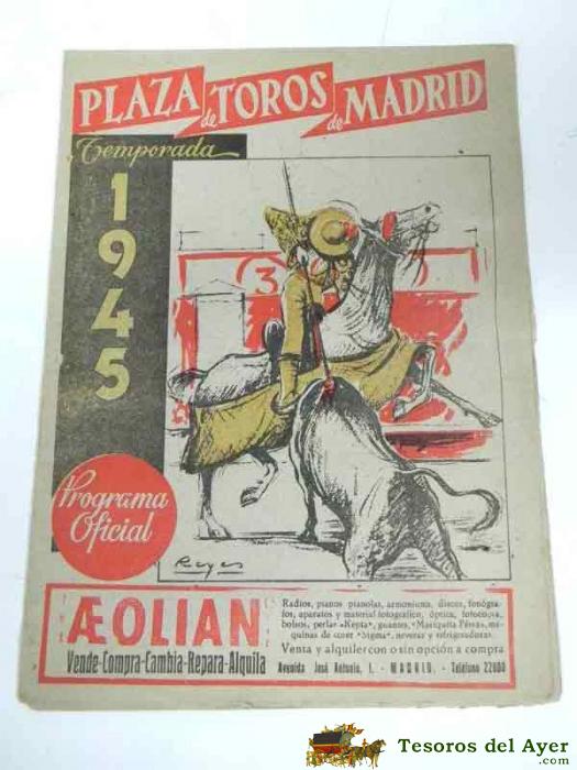 ANTIGUO PROGRAMA OFICIAL DE LA PLAZA DE TOROS DE MADRID - TEMPORADA 1945 - MIDE 22 X 16 CMS.