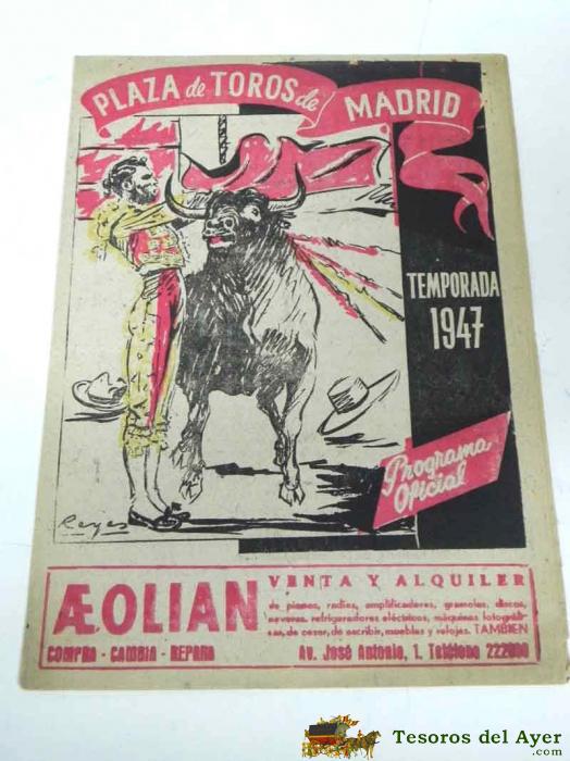 ANTIGUO PROGRAMA OFICIAL DE LA PLAZA DE TOROS DE MADRID - TEMPORADA 1947 - MIDE 22 X 16 CMS.
