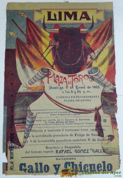 ANTIGUO CARTEL DE LA CORRIDA DE TOROS EN LA PLAZA DE LIMA, A BENEFICIO Y DESPEDIDA DEL FAMOSO ESPADA RAFAEL GOMEZ GALLO, MATADORES GALLO Y CHICUELO, ENERO DE 1922, MIDE 30 X 19 CMS.