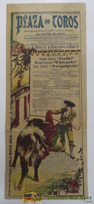 ANTIGUO CARTEL DE LA CORRIDA DE TOROS RIMAC, LIMA, CON LOS MATADORES RAFAEL GOMEZ GALLO, MANUEL JIMENEZ CHICUELO, ELIAS CHAVEZ ARIQUIPEÑO, LIT. TIP. P. BERRIO, LIMA, 8 DE ENERO DE 1922, MIDE 43 X 18 CMS., TIENE UNA RAJA EN LA PARTE INFERIOR Y OTRA A LA AL