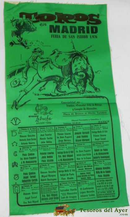 ANTIGUO CARTEL DE TOROS EN MADRID, FERIA DE SAN ISIDRO DE 1976, CON PUBLICIDAD DE BAR LA TRUCHA, ILUSTRADO POR ALVAREZ CARMONA, MIDE 50 X 26 CMS, EN SEDA PEGADO SOBRE PAPEL.