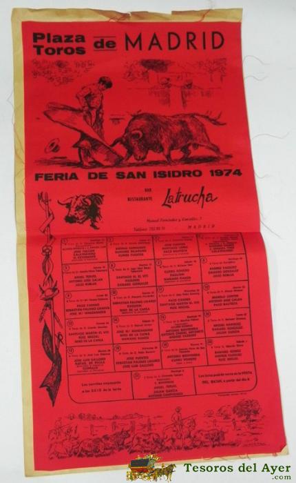 ANTIGUO CARTEL DE TOROS EN MADRID, FERIA DE SAN ISIDRO DE 1974, CON PUBLICIDAD DE BAR LA TRUCHA, ILUSTRADO POR SAAVEDRA, MIDE 50 X 26 CMS, EN SEDA PEGADO SOBRE PAPEL.