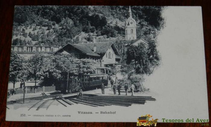 ANTIGUA POSTAL DE VITZNAU, BAHNHOF, SUIZA, N. 252, FERROCARRIL, CHARNAUX FRERES & CIA. GENEVE, NO CIRCULADA, SIN DIVIDIR.
