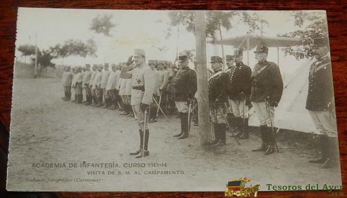 ANTIGUA FOTO POSTAL DE ALFONSO XIII DE VISITA AL CAMPAMENTO - ACADEMIA DE INFANTERIA - CURSO 1913-14 - GABINETE FOTOGRAFICO CARMONA - NO ESCRITA NI CIRCULADA