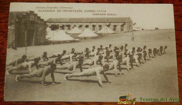 ANTIGUA FOTO POSTAL DE ACADEMIA DE INFANTERIA, CURSO 1913-14, GIMANSIA SUECA, GABINETE FOTOGRAFICO CARMONA, NO ESCRITA NI CIRCULADA.