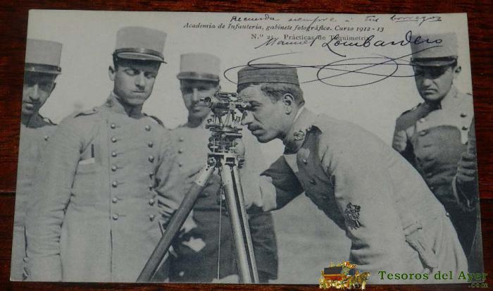 ANTIGUA POSTAL DE LA ACADEMIA DE INFANTERIA, GABINETE FOTOGRAFICO - CURSO 1912 / 13 - N. 25 - PRACTICAS DE TAQUIMETRIA - NO CIRCULADA - ED. PELAEZ.