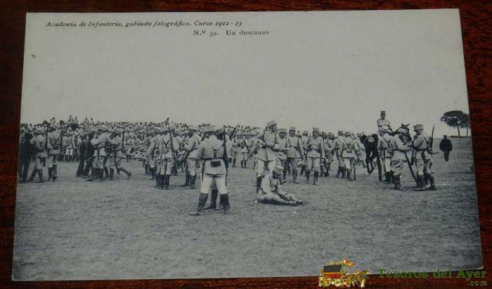 POSTAL DEL GABINETE FOTOGRáFICO DE LA ACADEMIA DE INFANTERíA DE TOLEDO, CURSO 1912-13. N. 39. UN DESCANSO. NO CIRCULADA. ESCRITA Y FIRMADA POR UN MILITAR DE LA PROMOCIóN.