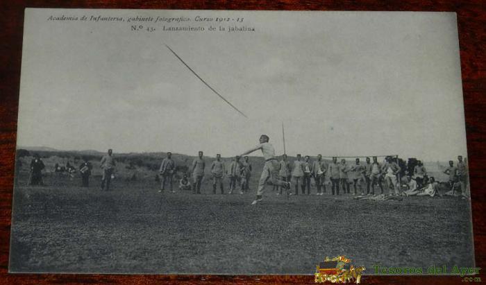 POSTAL ACADEMIA DE INFANTERíA DE TOLEDO, GABINETE FOTOGRáFICO CURSO 1912-13, LANZAMIENTO DE LA JABALINA, N. 43, ESCRITA Y FIRMADA POR EL REVERSO POR UN MILITAR DE LA PROMOCIóN.