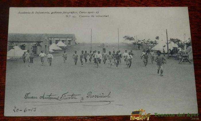 POSTAL ACADEMIA DE INFANTERíA DE TOLEDO, GABINETE FOTOGRáFICO CURSO 1912-13, CARRERA DE VELOCIDAD, N. 45, ESCRITA Y FIRMADA POR EL REVERSO POR UN MILITAR DE LA PROMOCIóN.