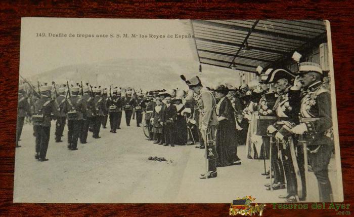 POSTAL DE SAN SEBASTIAN, Nº 149, DESFILE DE TROPAS ANTE REYES DE ESPAÑA, ALFONSO XIII, GUIPUZCOA, MONARQUIA, ED. MAYOR HERMANOS.